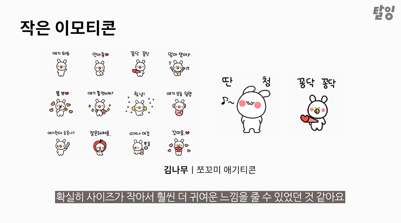 사이즈가 줄어들기때문에 복잡한 요소도 함께 줄이면서 단순하면서도 성격이나 전달하고자 하는 바를 분명히 드러내는 것이 핵심인 미니 사이즈의 이모티콘