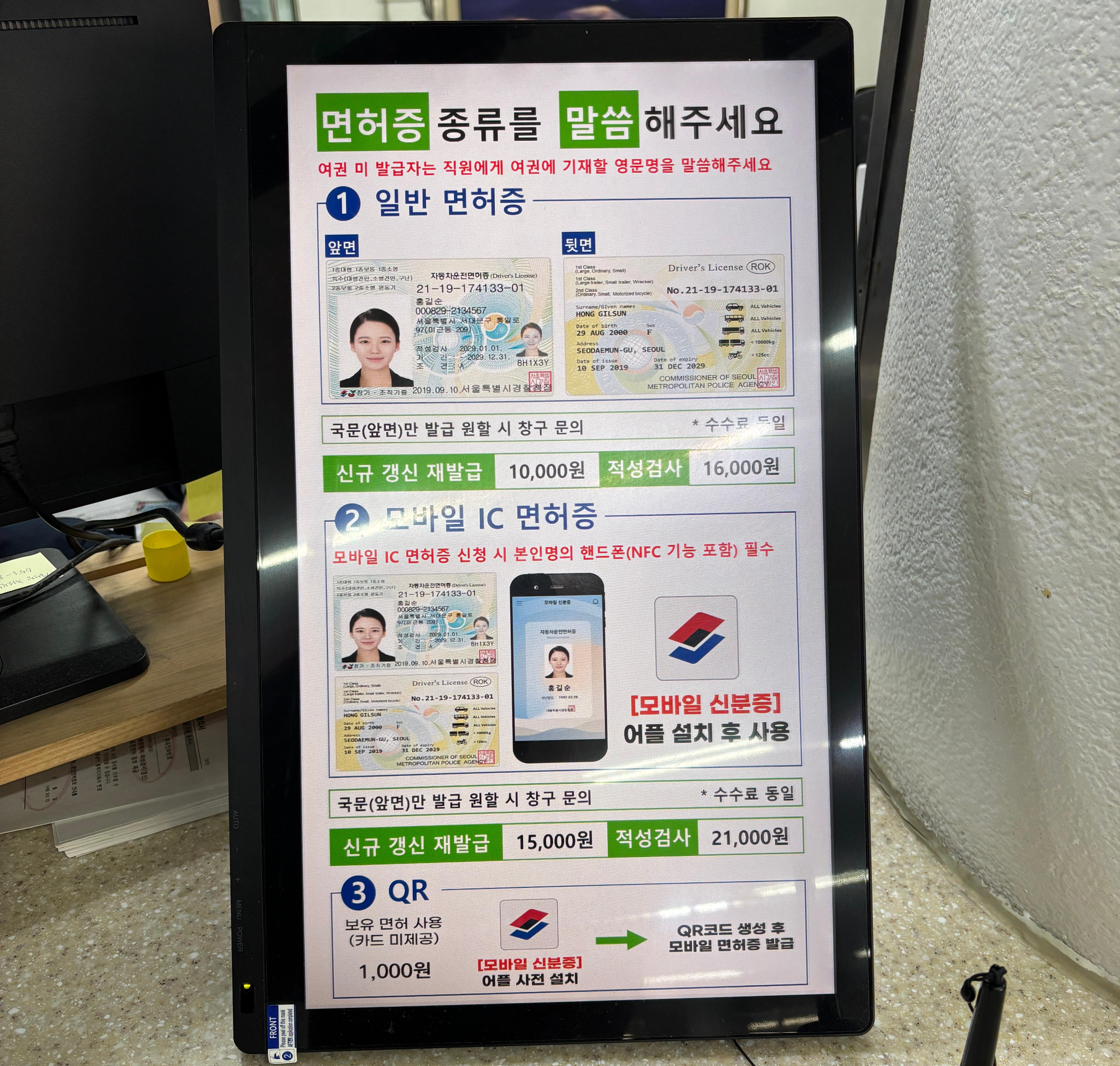 • 필요서류 신분증, 기존 면허증, 증명사진(3.5cm × 4.5cm) 2매
