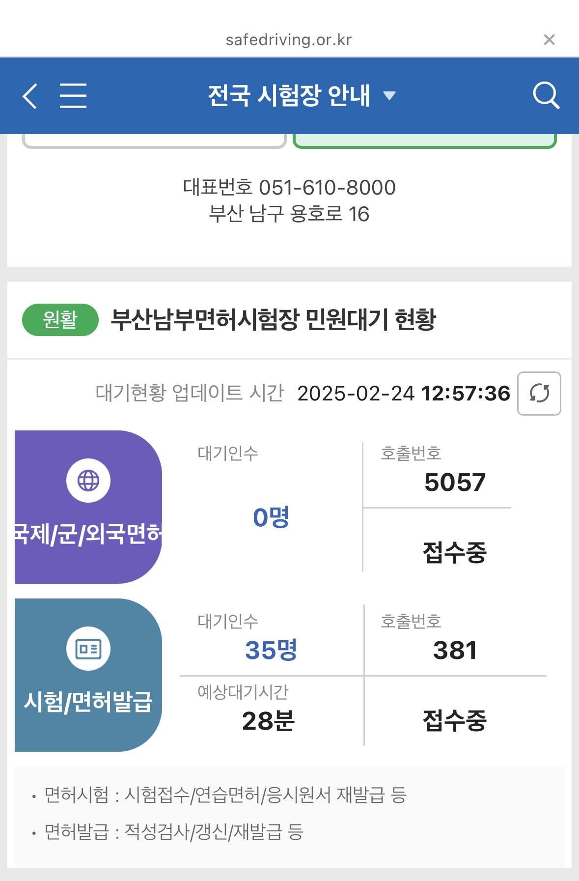 방문할 시험장의 대기인수 및 예상 대기시간을 실시간으로 확인할 수 있으니 참고하면 좋다.