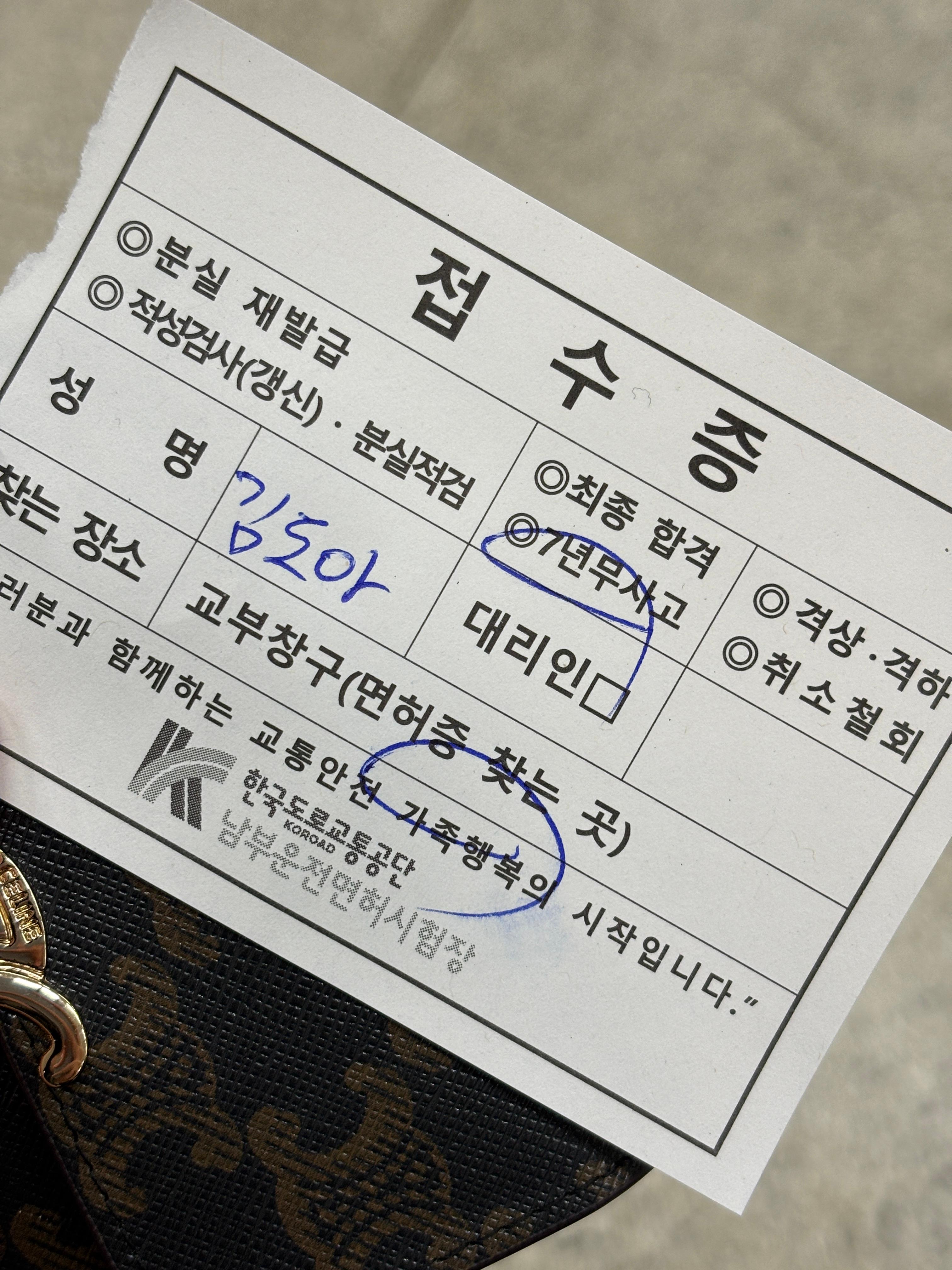 그 중 7년 무사고 갱신에 필요한 서류를 작성하고 접수증을 받는다.