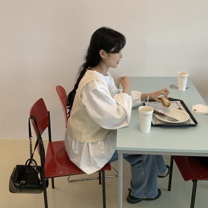 아직까지는 아침저녁으로 일교차가 큰 날씨라 셔츠 위에 니트 베스트를 입어주는것도 추천한다.