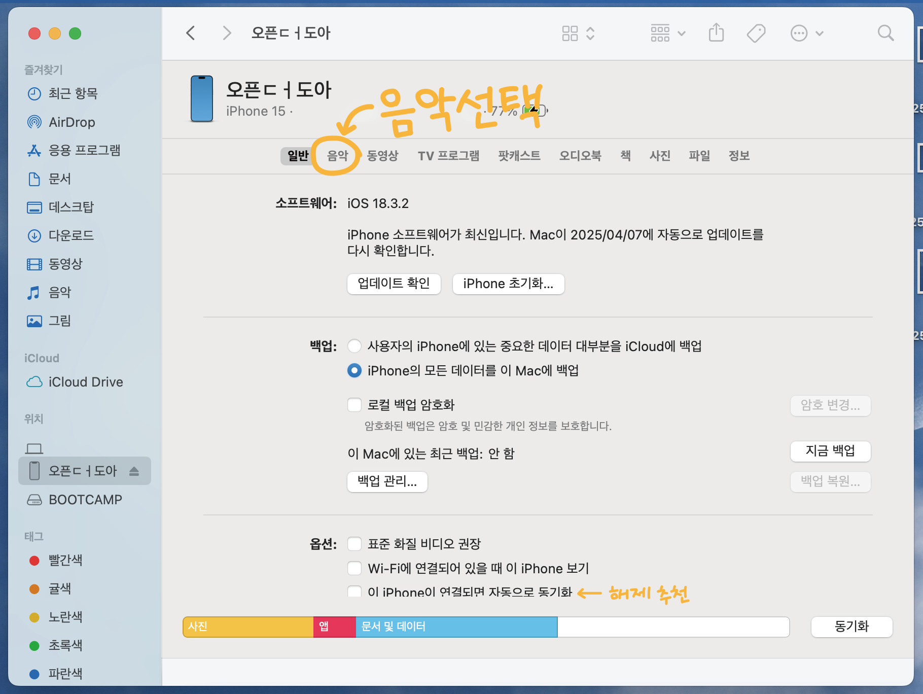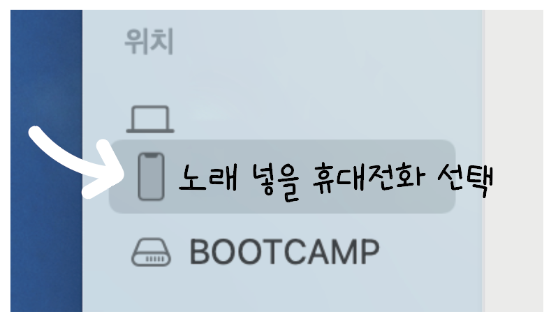 그 다음 사이드바에서 연결된 아이폰을 선택해주는데