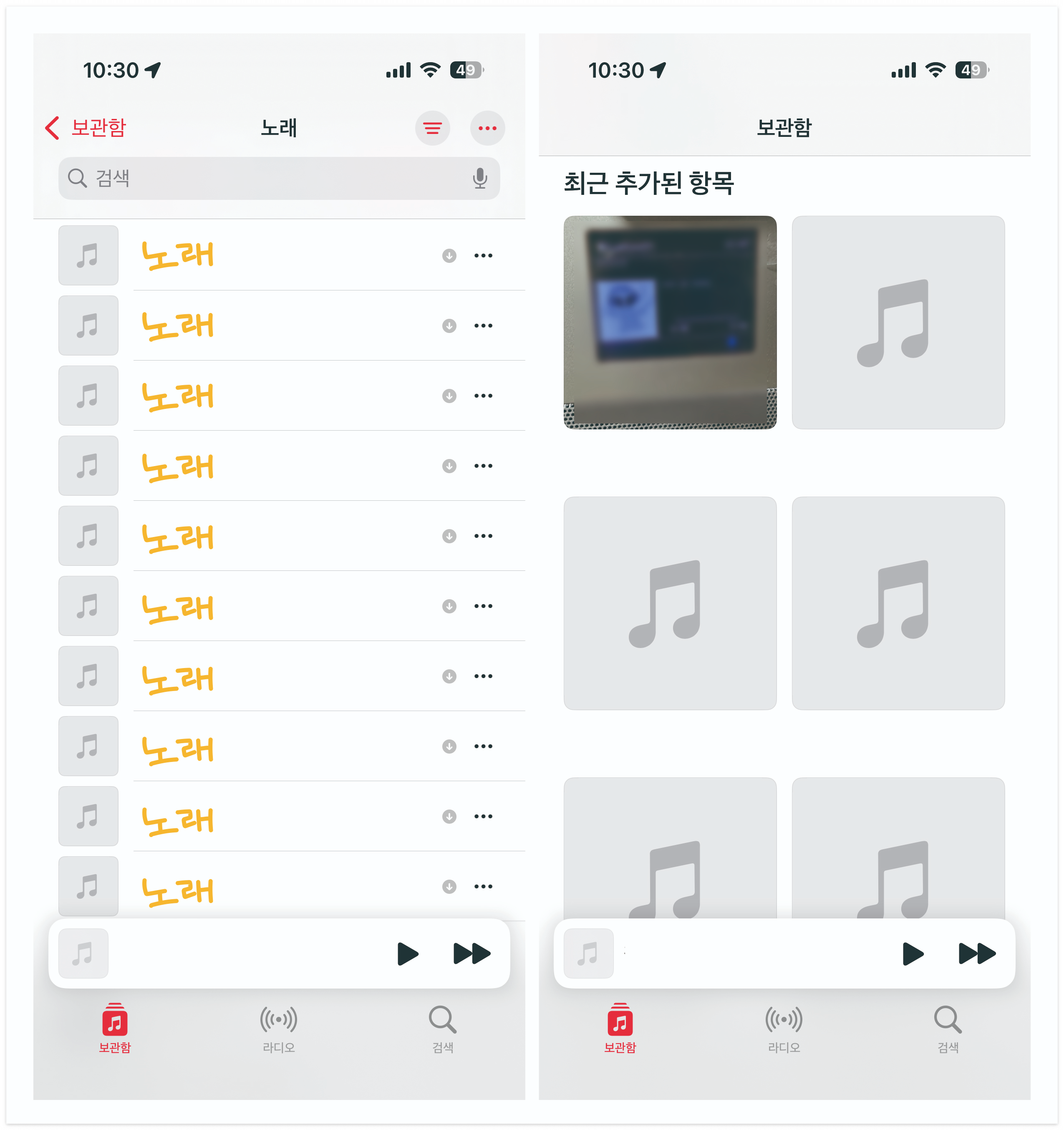 아이폰 [음악] 어플을 들어가보면 추가한 노래들이 들어가있는것을 볼 수 있다.