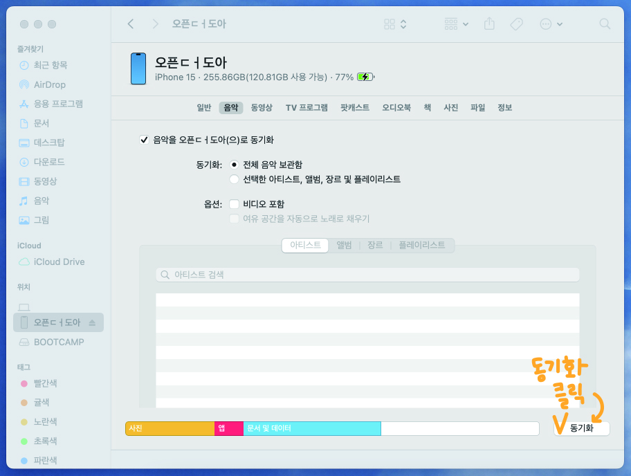 그 다음 [음악]탭에서 우측 하단에 있는 [동기화] 버튼을 눌러주면 완료
