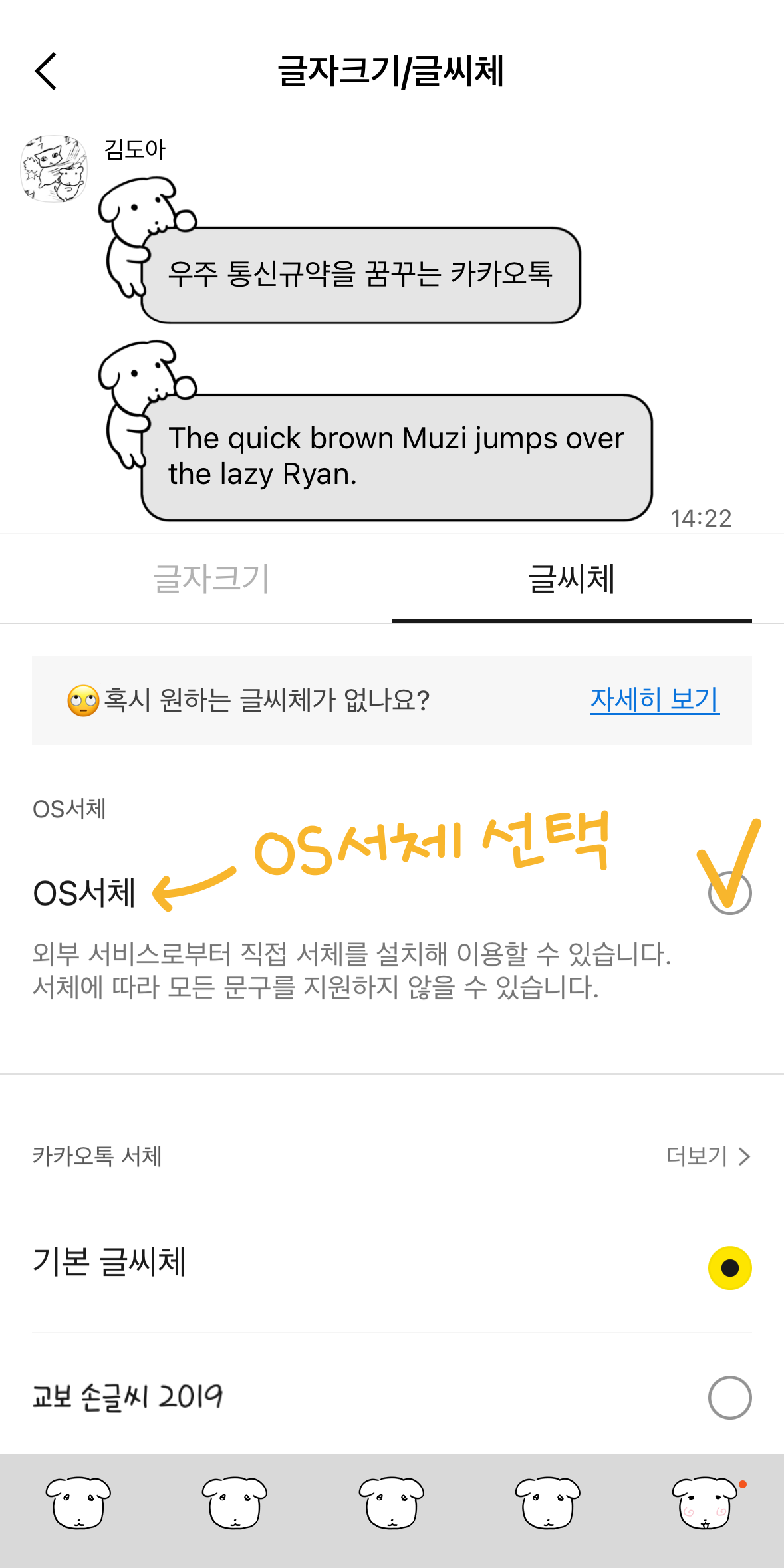 카톡 설정 - 화면 - 글자크기/글씨체 쪽으로 들어간 후