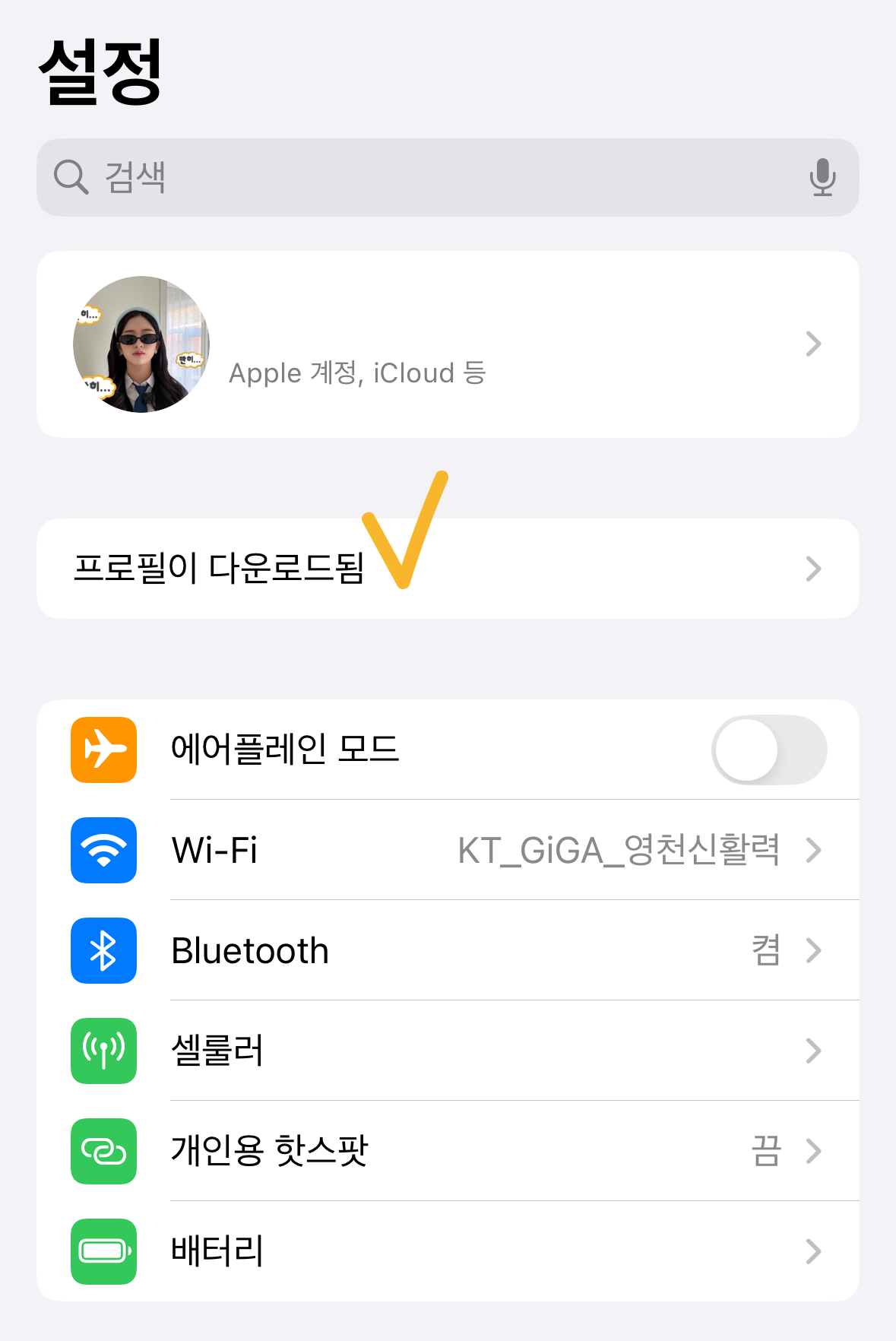 [설정]으로 들어가면 계정 밑쪽에 생긴 '프로필이 다운됨' 버튼을 눌러주고
