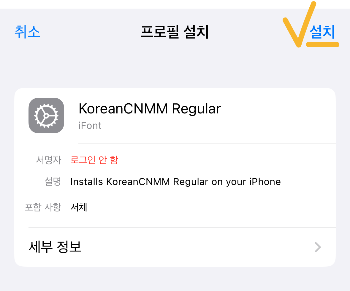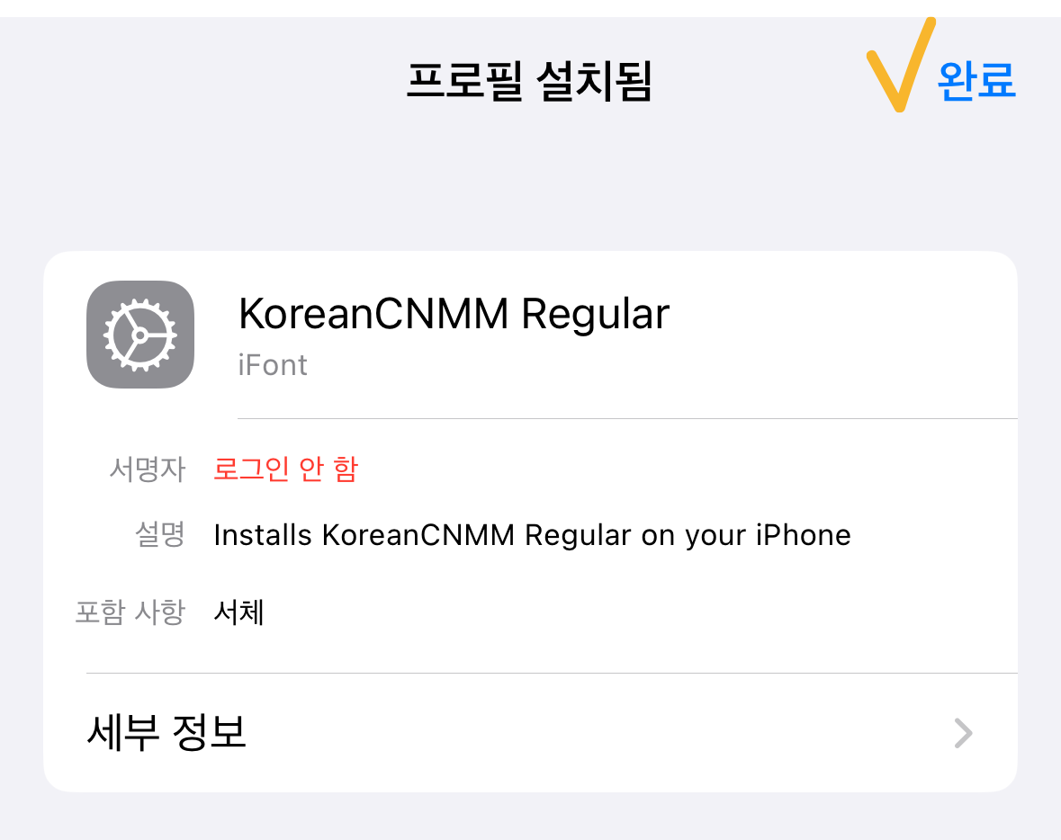 이 뒤에 서명하지 않은 프로필로 경고메세지가 뜨는데 '설치→완료'를 눌러주면 된다.