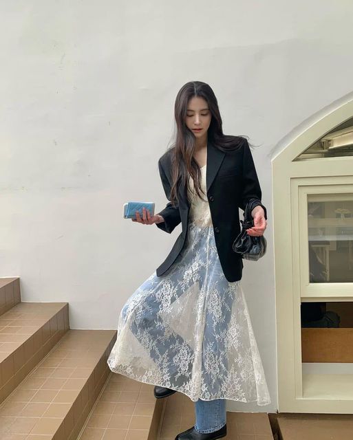 • 슬립 드레스 + 가벼운 린넨 블레이저