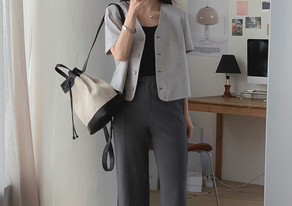 이너로는 화이트 슬리브리스나 라운드넥 반팔 니트를 매치하면 깔끔한 인상을 줄 수 있고, 셋업 하의는 단독으로 활용해 다른 룩에도 재활용할 수 있습니다.